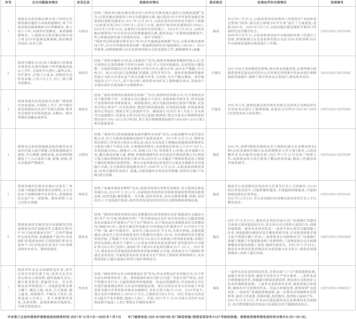 截止2021年12月16日16时,中央第三生态环境保护督察组交办涉及商洛市生态环境信访件44件,目前已办结11件,现将第三批7件办理结果通报如下: