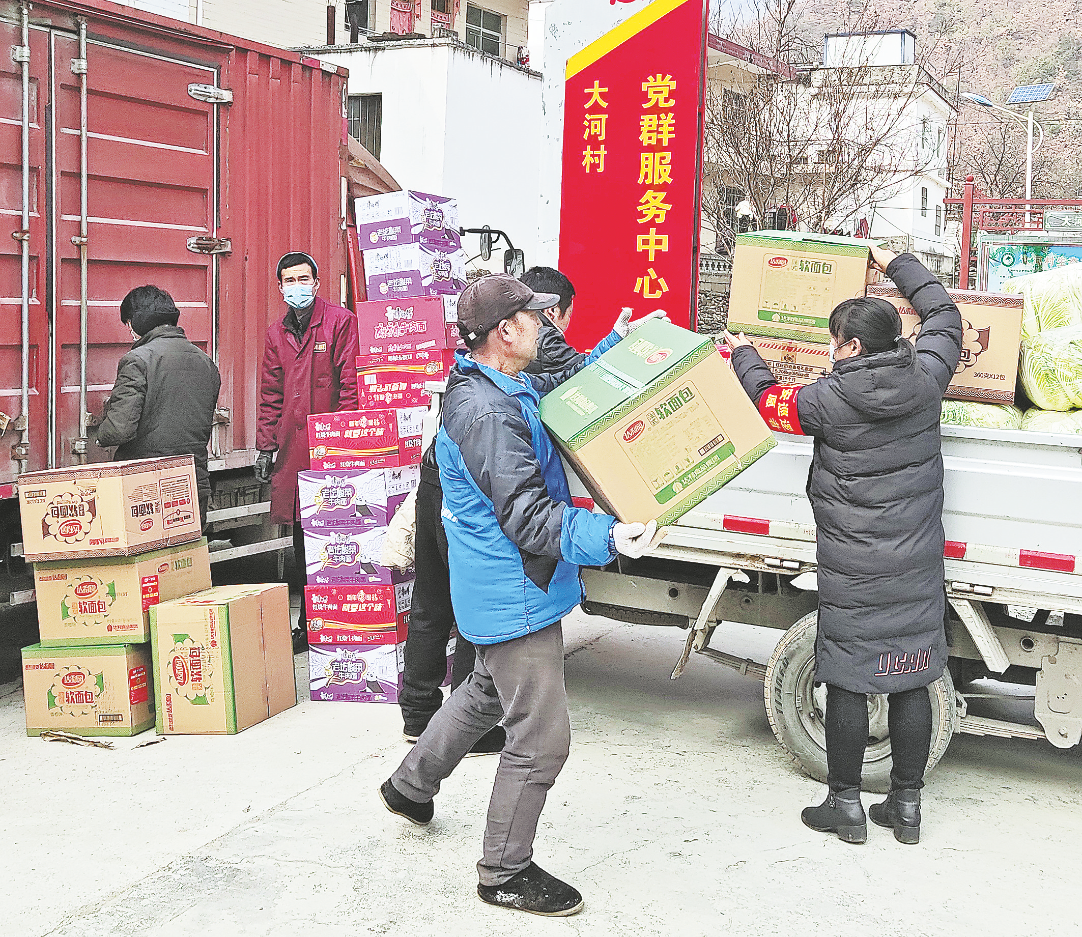 1月10日,柞水县瓦房口镇大河村股份经济合作社购买方便食品、蔬菜、饮料等,捐赠给瓦房口镇7个村,为疫情防控工作贡献力量。 (记者 王 倩 摄)