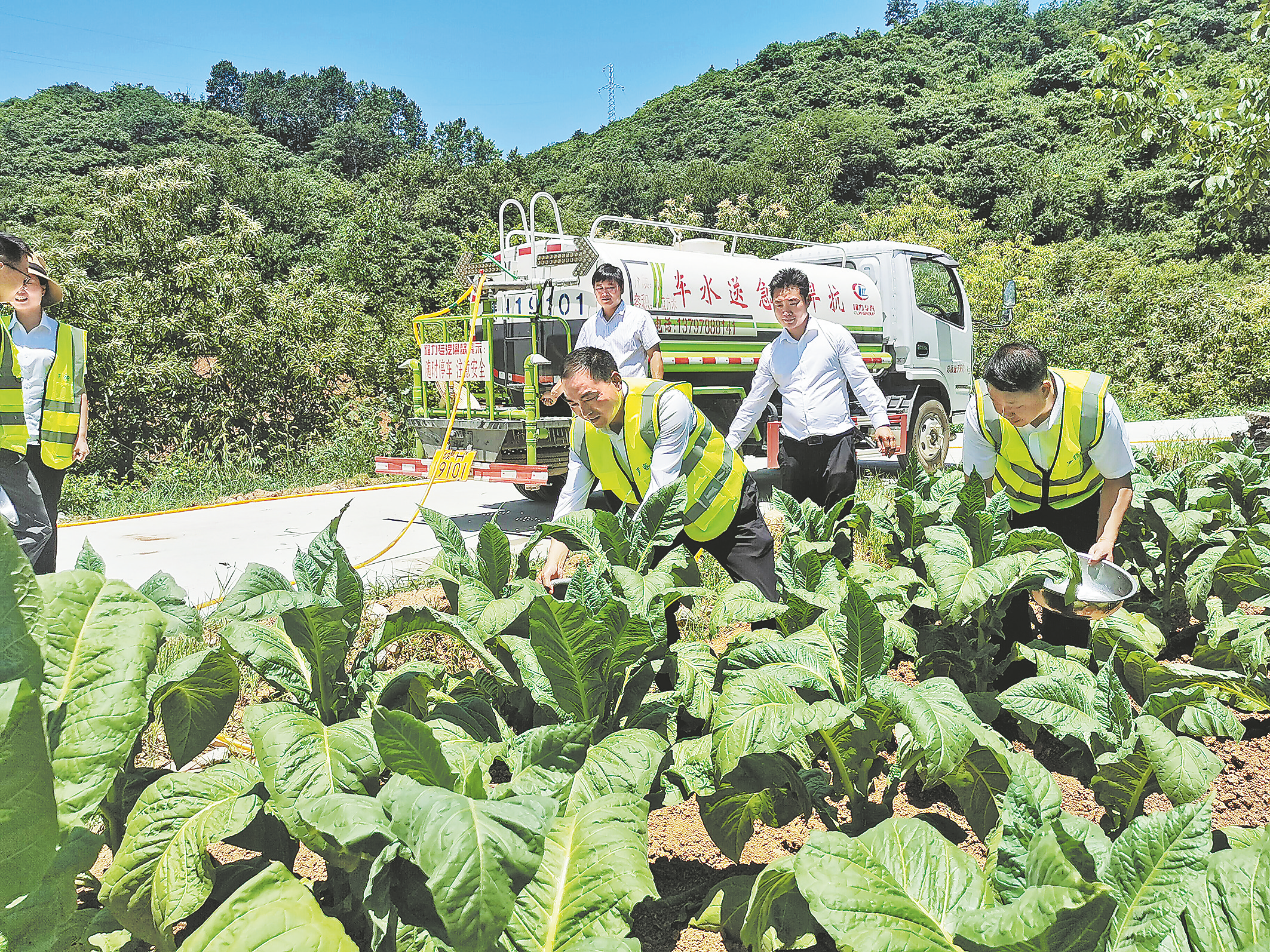 当前是田间作物生长关键期,镇安县组织力量,启动灌溉设施,抗旱保墒夺丰产。图为6月14日,镇安县月河镇组建抗旱小分队,动员镇、村力量100多人,组织送水车2辆,携带水罐50多个,分赴烤烟基地抗旱保墒。 (本报通讯员 陈绪荣 摄)
