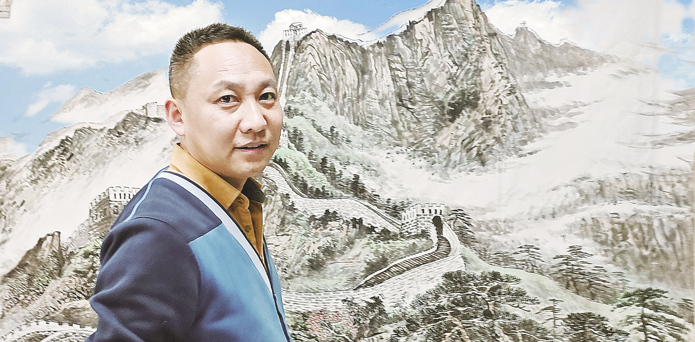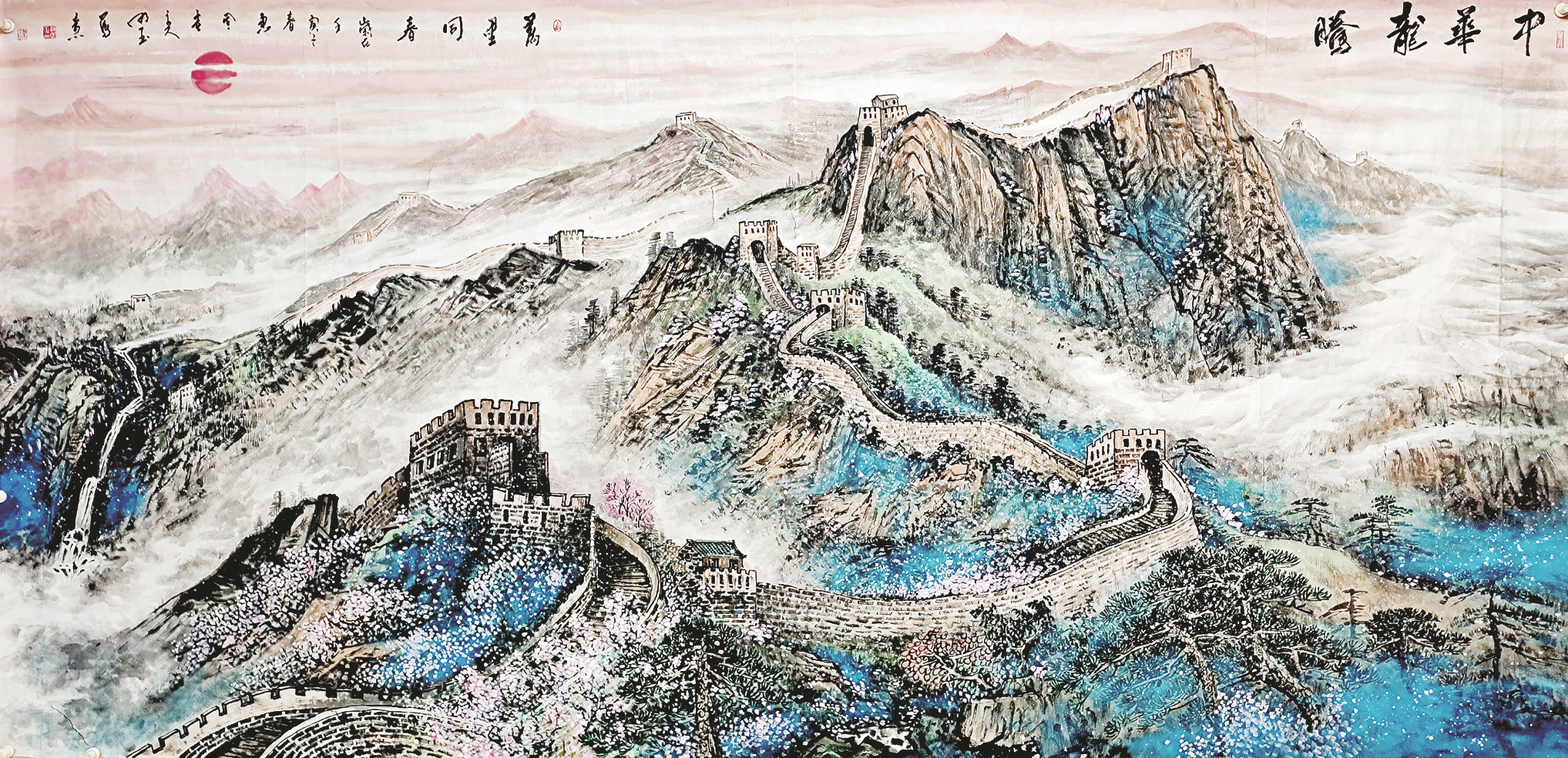 一幅丈二的山水画卷在他的笔下徐徐铺陈开来,蜿蜒于群山峻岭中的长城映入眼帘,高耸的烽火台没入远处的云雾里,忽隐忽现,秦时的长城如一条腾起的巨龙守护着祖国的壮丽河山。山势陡峭,云雾缭绕,山林层峦叠翠,山下桃花盛开,不仅让人想起毛主席的诗词“望长城内外,惟余莽莽,大河上下,顿失滔滔”“雄关漫道真如铁,而今迈步从头越”的豪迈和激情。