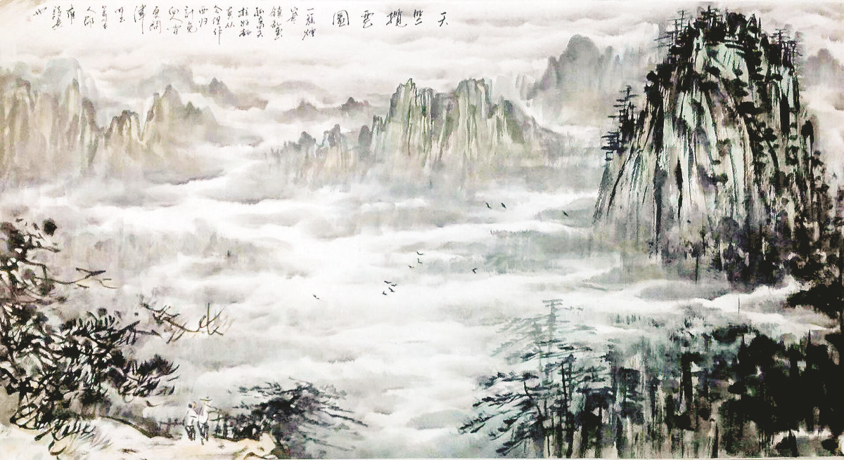 他并不拘泥于山水的形态,而是力求呈现山势的磅礴大气、山峦的高耸入云、山石的嶙峋陡峭,并将山与云、山与树完美结合,呈现一种云在山中游、山在云中立的空灵状态,画作中多有鸟雀、幽亭、小桥、瀑布、人家,布局奇巧,笔墨从容,远山由近及远逐步推进,凸显空间感和纵深感,营造出的画面意境悠远,层次递进,感染力强,将中国水墨画的“气韵生动”和“以形写神”呈现得淋漓尽致。