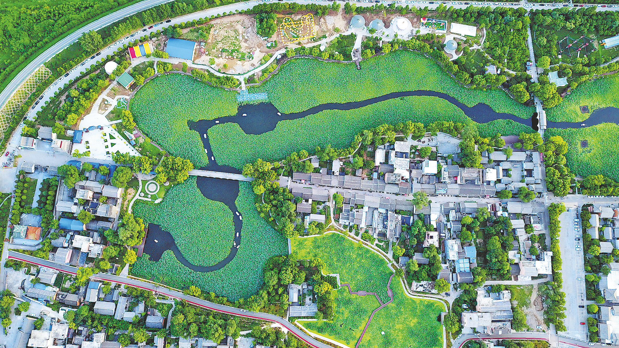 丹凤县棣花古镇是国家4A级景区。著名作家贾平凹将棣花镇的风土人情和山水景色写进了小说《秦腔》之中,在这里可以漫步宋金边城,穿过清风老街,观赏千亩生态荷塘,感受历史、人文、生态相互交融的文旅与康养深度融合特色景观。图为千亩生态荷塘。 (本报记者 杨 鑫 摄)