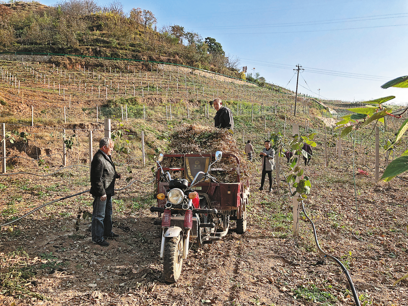 深秋的丹凤县棣花镇许家塬村,务工人员在村集体经济合作社300亩猕猴桃和葡萄基地里,采收成熟了的大豆。为了充分利用闲置的土地,该村在猕猴桃和葡萄基地全部播种大豆,入秋后一派丰收的景象,预计可采收大豆8500公斤,集体经济增收6.5万元,带动村民务工收入4万元。 (本报通讯员 贾建霞 摄)