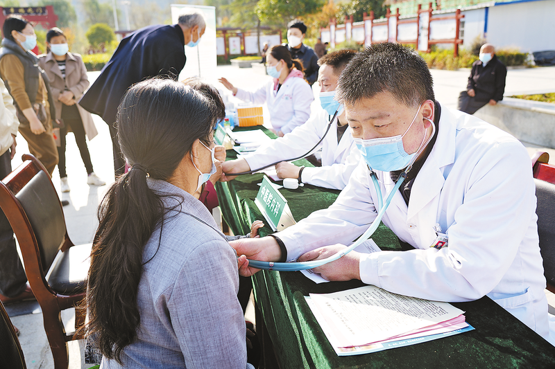 10月23日,丹凤县中医医院组织医疗小分队到竹林关镇开展义诊活动,为村民检查身体、普及医学常识和健康知识,将优质的医疗服务送到了群众身边,使社区居民享受到了“家门口的便利”。 (本报通讯员 苏甜甜 摄)