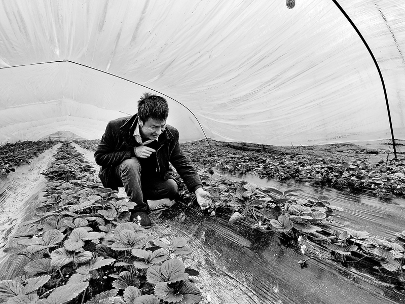 12月1日一大早,姜年良在大棚查看草莓挂果情况。姜年良多年来在镇安县永乐街道太平村租种土地20多亩种植草莓,今年种植的反季草莓已经挂果,元旦前即可上市,估计毛收入6万元左右。 (本报通讯员 杨建东 摄)