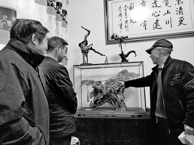 △村民方启祥(右一)介绍自己的根雕作品