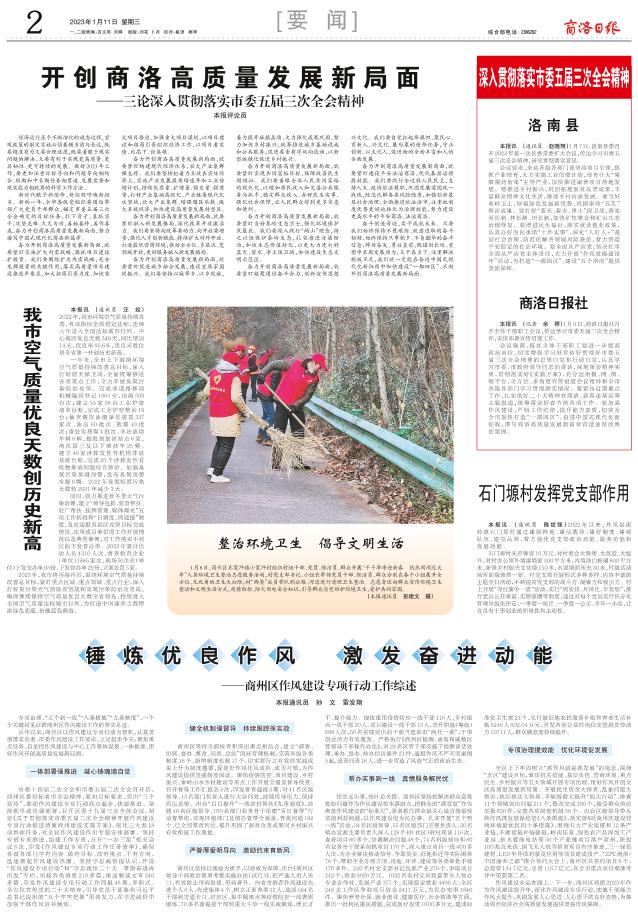 1月8日,商州区北宽坪镇小宽坪村组织村组干部、党员、保洁员、群众开展“干干净净迎新春 热热闹闹过大年”人居环境卫生整治志愿服务活动,村党支部书记、小组长带领党员干部、保洁员、群众分别在各个小组展开全方位、无死角的卫生大扫除,村“两委”成员带队到公路、河道进行清理卫生整治。志愿者还向群众宣传环境卫生整治和文明生活方式、疫情防控、防火用电安全知识,引导群众自觉维护环境卫生,爱护共同家园。