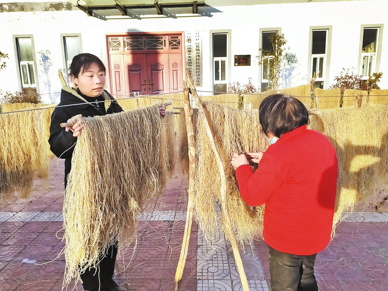 1月8日,丹凤县棣花镇万湾村贾喜阳雇佣村民晾晒加工红薯粉条。近年来,贾喜阳每年冬季加工红薯粉条1万多公斤,带动村里10多名劳动力从事红薯粉条加工,人均年增收6000多元。