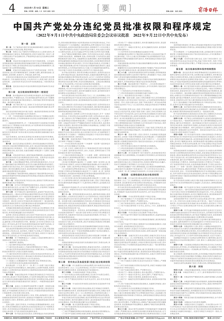 中共中央印发《中国共产党处分 违纪党员批准权限和程序规定》