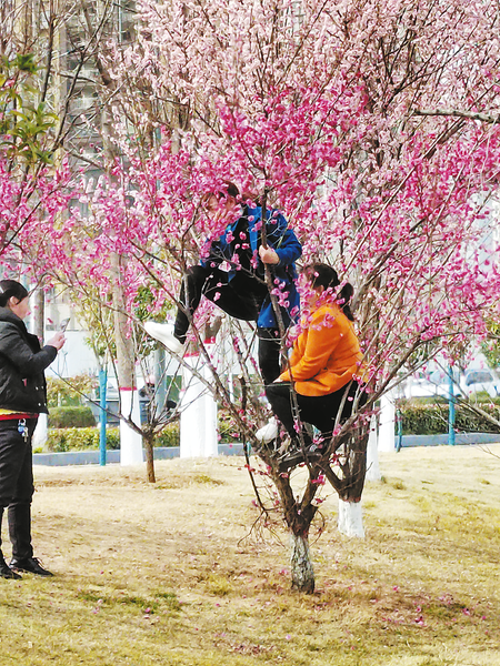 二月二十八日,在商州滨江银杏公园,几名市民攀上枝头拍照。希望大家文明游园,爱护花草树木,共享春日美景。(本报记者支晓宇摄)