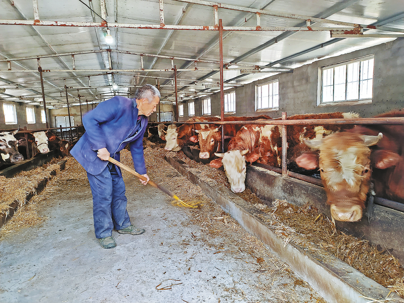 2月24日,在位于山阳县色河铺镇屈家涧村的山阳县秦山绿源生态农牧业公司肉牛养殖场,饲养员正在给牛添加饲料。该养殖场年养肉牛600多头,安置10多人务工,人均月收入2200多元,季节性灵活用工100多人,增加了当地群众收入。(本报记者 贾书章 摄)