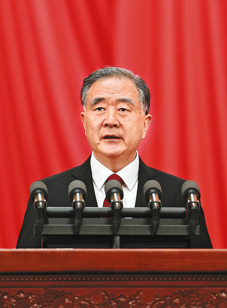 下午3时,王沪宁宣布大会开幕,全体起立,高唱中华人民共和国国歌。