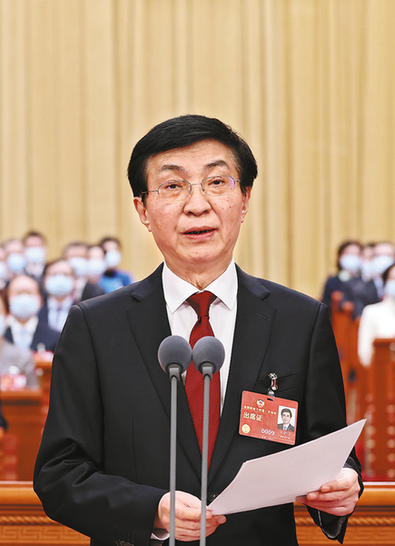 十三届全国政协主席汪洋代表政协第十三届全国委员会常务委员会向大会报告工作。(新华社记者 丁海涛 摄)