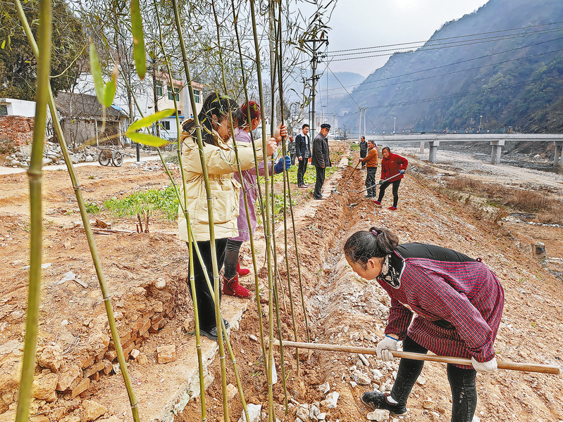 2月27日,丹凤县武关镇利用春耕农闲时机,组织村民在段湾村补种竹子,为乡村增绿补绿。近期该镇从补齐设施短板入手,扎实开展农村环境整治工作,推进秦岭山水乡村建设步伐。 (本报通讯员 李昱澎 摄)