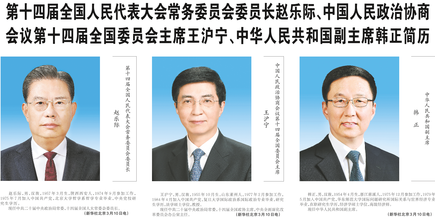 第十四届全国人民代表大会常务委员会委员长赵乐际、中国人民政治协商会议第十四届全国委员会主席王沪宁、中华人民共和国副主席韩正简历