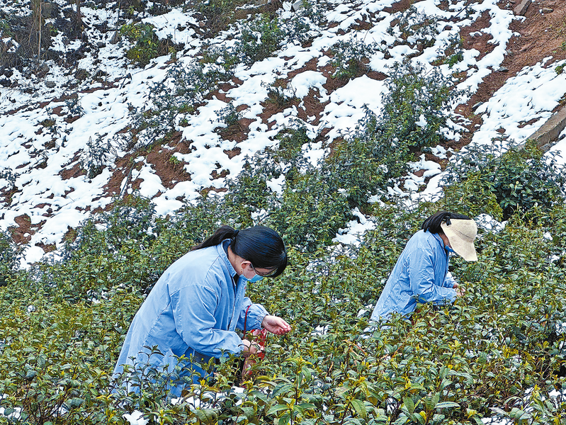 初春三月,新茶吐绿。一场春雪悄然而至,为商南县富水镇的万亩茶园增添了别样景致。图为3月17日,茶农们雪中采茶,开始忙活一年的茶事。 (本报见习记者 杨 萌 摄)