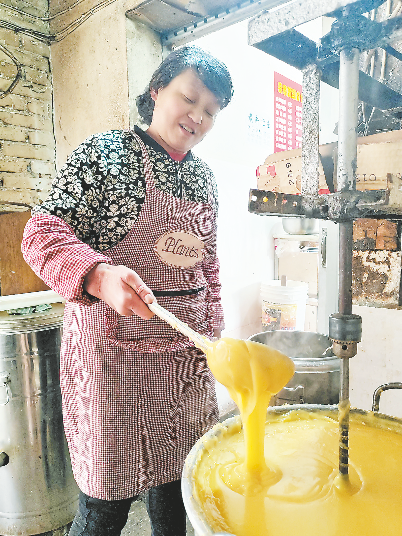 操作台旁边的高筒锅里,金黄色的搅团在一个电动搅拌杆的带动下咕嘟咕嘟冒着热汽。这个固定在锅上方的电动搅拌杆,是20世纪90年代自动机器还不盛行的时候,余锡兰经人点拨,让丈夫专门找人设计制作的,这个“半自动机器”省了她的许多力气。在机器搅拌下,金黄色的搅团变得丝绸般细腻顺滑,余锡兰用勺子轻轻搅动,掌握着稀稠和火候,一边念起了顺口溜:“搅团做得好,就要工序到、火工到,稀稠掌握好。古话说过,有巧没巧,七十二搅,你搅好熬到,它就自然好;你不偷工减料,它就自然好。”最后,她用勺子舀起来,搅团在勺和锅之间垂落成一条丝带,连绵不断,就算是做好了。而过去,余锡兰一天做两三锅搅团,全靠擀面杖搅,做过搅团的人都知道,那可是很费力气的活。