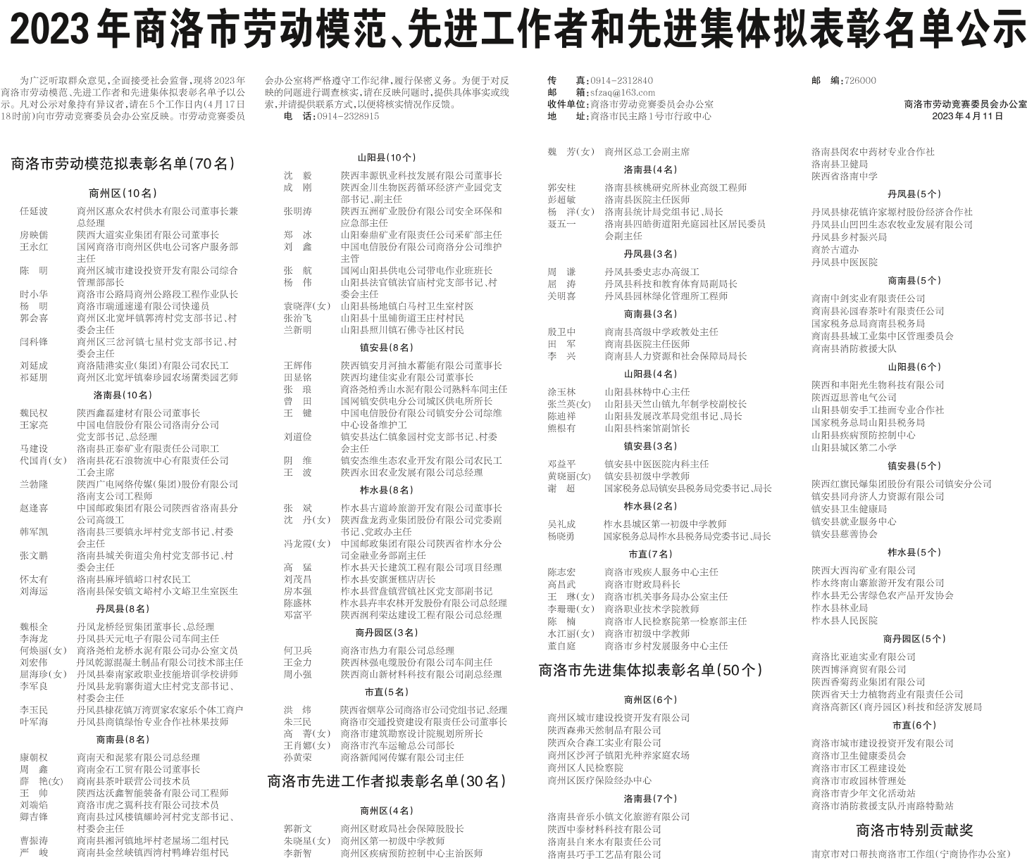 2023年商洛市劳动模范、先进工作者和先进集体拟表彰名单公示