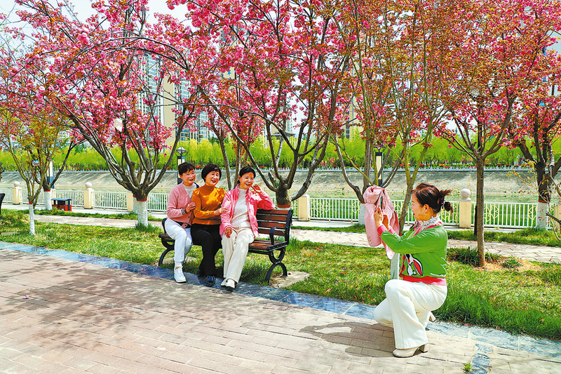 随着天气回暖,商洛滨江银杏公园的樱花次第绽放,春色满园,吸引了游人前来观赏游玩。图为4月7日,游人在公园里拍照留念。 (本报通讯员 田亚鹏 摄)