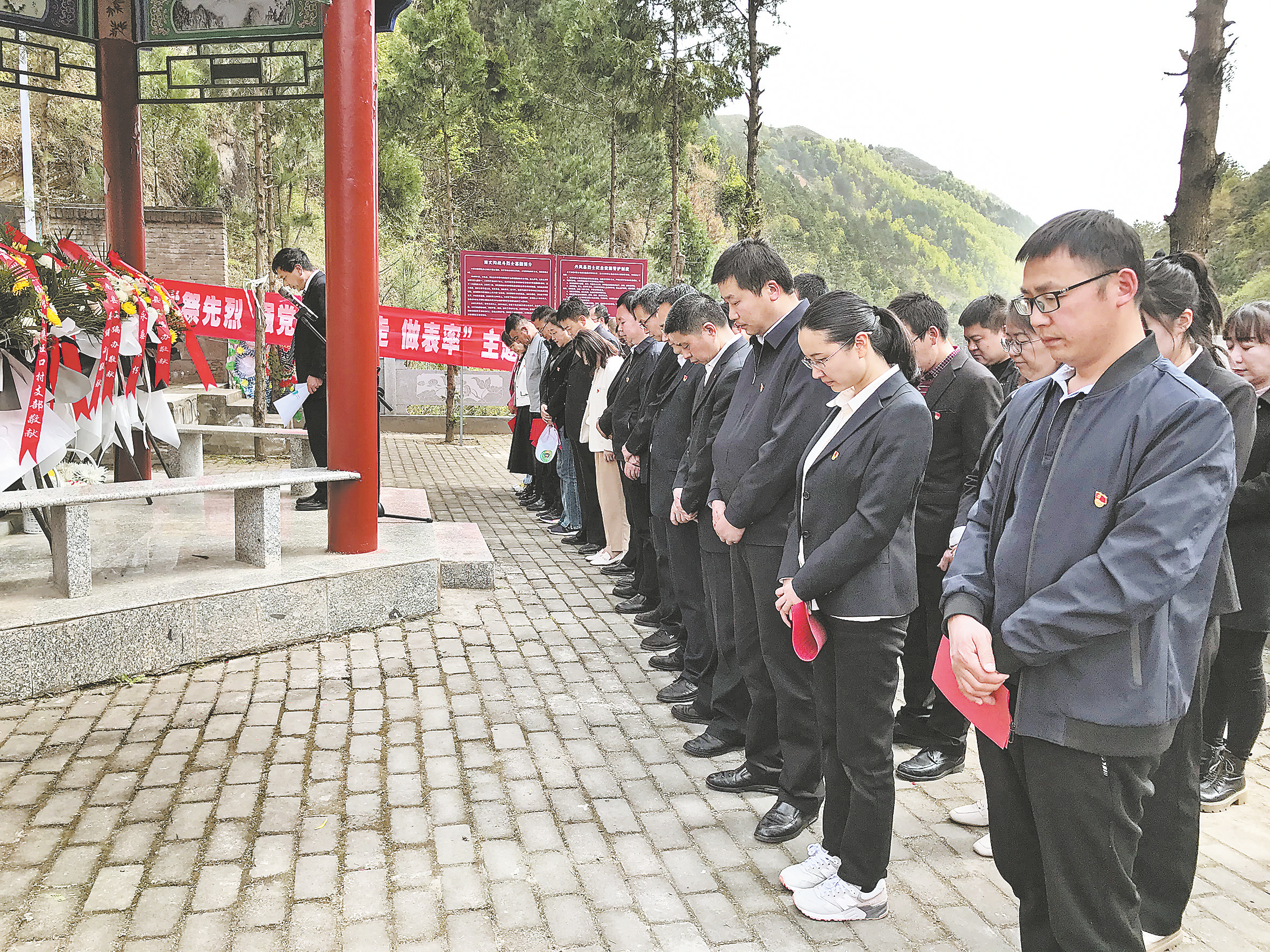 4月7日,市委编办党支部、商州区杨峪河镇垭口村党支部的党员来到丹凤县竹林关镇南丈沟战斗烈士墓园,举办了“祭先烈 强党性 跟党走 做表率”主题党日活动。 (本报记者 胡 蝶 摄)