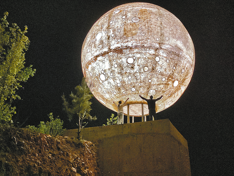 我们追着“月光”驱车十几分钟,然后沿着山路爬上山,终于见到了实景。一轮大大的米色球形灯耸立在树林之中,有小情侣在“月”下窃窃私语,颇有意境。