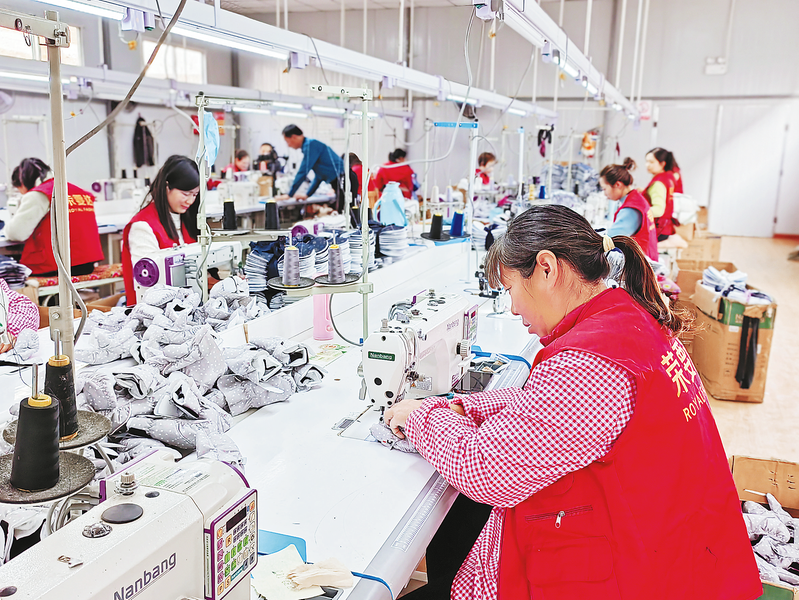近年来,洛南县紧抓苏陕协作对口帮扶机遇和平台,引进劳动密集型企业落户易地搬迁小区,吸纳安置更多群众就地就近就业。图为周边劳务人员在苏陕协作社区工厂三要镇荣耀达服饰有限公司加工手套。