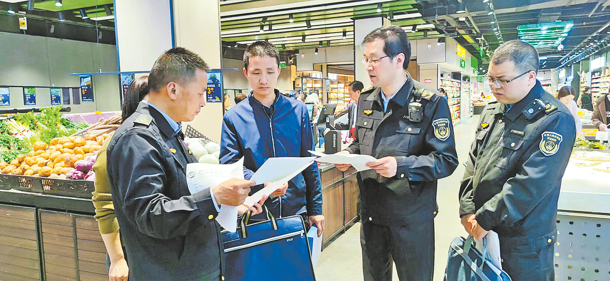连日来,商南县组织相关部门对县域内餐饮门店、农家乐、超市、水产交易市场、渔具店等违法加工、售卖野生水产品和使用禁用渔具行为开展联合执法检查,坚决打赢长江禁渔持久战。图为执法人员在水产超市水产区查验水产进货渠道。(本报通讯员 万小丹 摄)