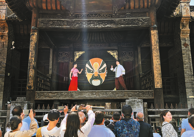 “五一”假日期间,山阳县漫川关镇吸引了众多游人。图为游客在双戏楼前观看戏曲表演。(本报记者 李 敏 摄)