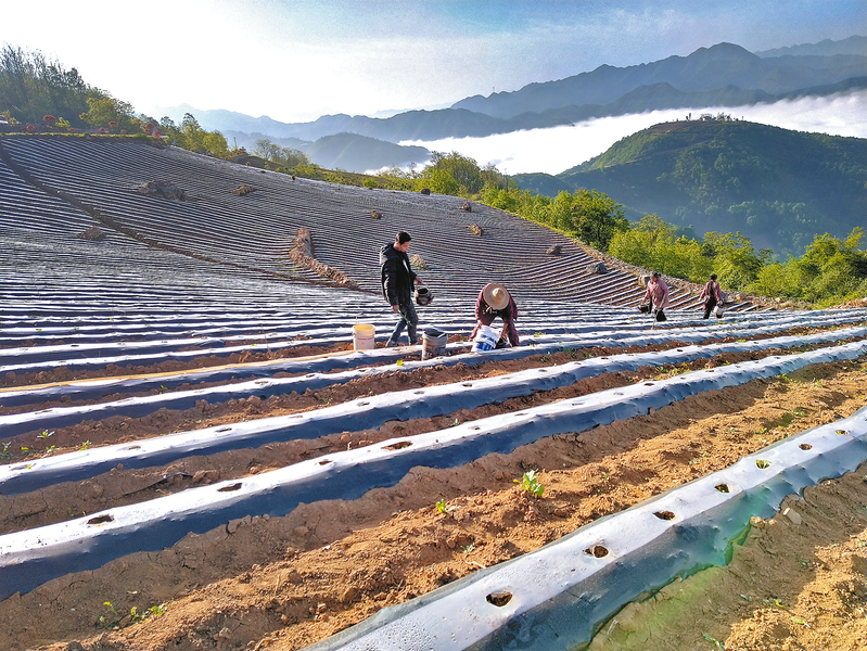 目前,正是烤烟苗移栽时节,镇安县永乐街道鞍山村大力发展烤烟经济,带领村民增收致富。图为鞍山村村民在烤烟田移栽烤烟苗。(本报通讯员 杨建东 摄)