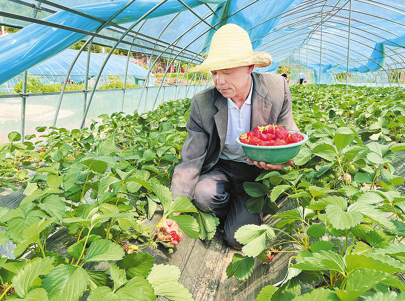 近日,在商州区板桥镇下湾村草莓示范园内,村民郝彦子在自己承包的大棚内采摘草莓。据他介绍,自己承包了12个大棚,每个大棚可产草莓1000公斤以上,收益3万多元。 (本报记者 李 敏 摄)