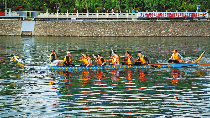 5月11日,在商州区丹江河道内参加“22℃商洛·中国康养之都”2023年首届商洛丹江龙舟大赛的队伍正在紧张训练之中。据了解,5月27至28日将在市区银杏公园景区河道内举办丹江龙舟大赛,参赛队伍共22支,分为公开组12支及社会组10支代表队。公开组选手来自广东、福建、浙江、湖南、陕西等,社会组(区县组)包括商洛区县代表队,共计320多名选手参赛。(本报记者 杨 鑫 摄)