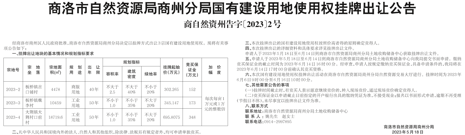 商洛市自然资源局商州分局国有建设用地使用权挂牌出让公告