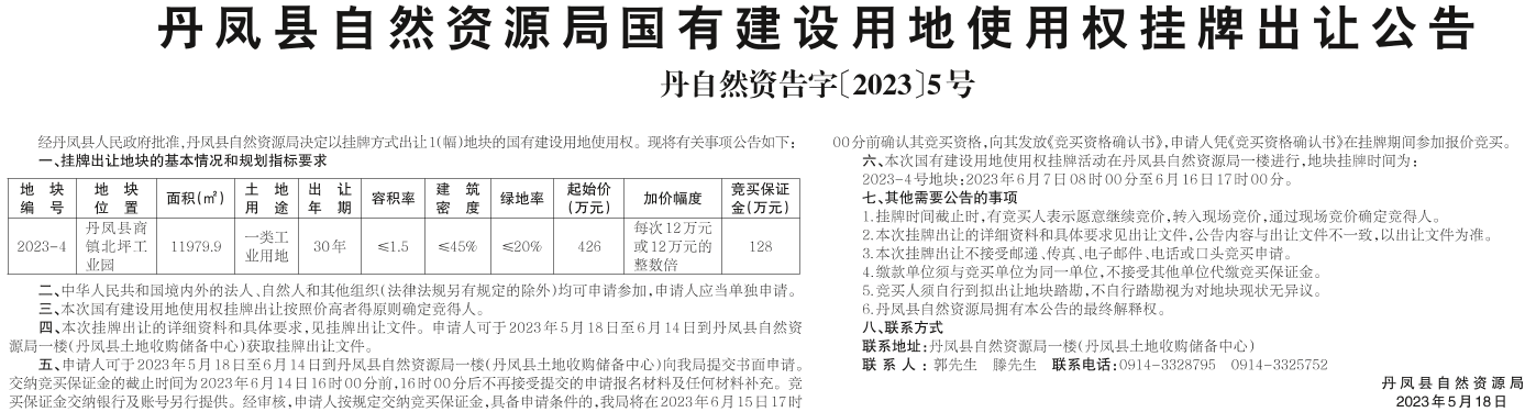 丹 凤 县 自 然 资 源 局 国 有 建 设 用 地 使 用 权 挂 牌 出 让 公 告