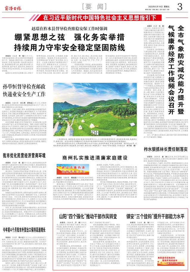 本报讯 (记者 李 敏)5月18日,市委书记赵璟深入柞水县督导检查维稳安保工作。她强调,做好中国—中亚峰会维稳安保工作是当前压倒一切的重大政治任务,务必绷紧思想之弦、强化务实举措,以最高标准、最严要求、最实作风,持续用力守牢安全稳定坚固防线,全力以赴营造良好环境。