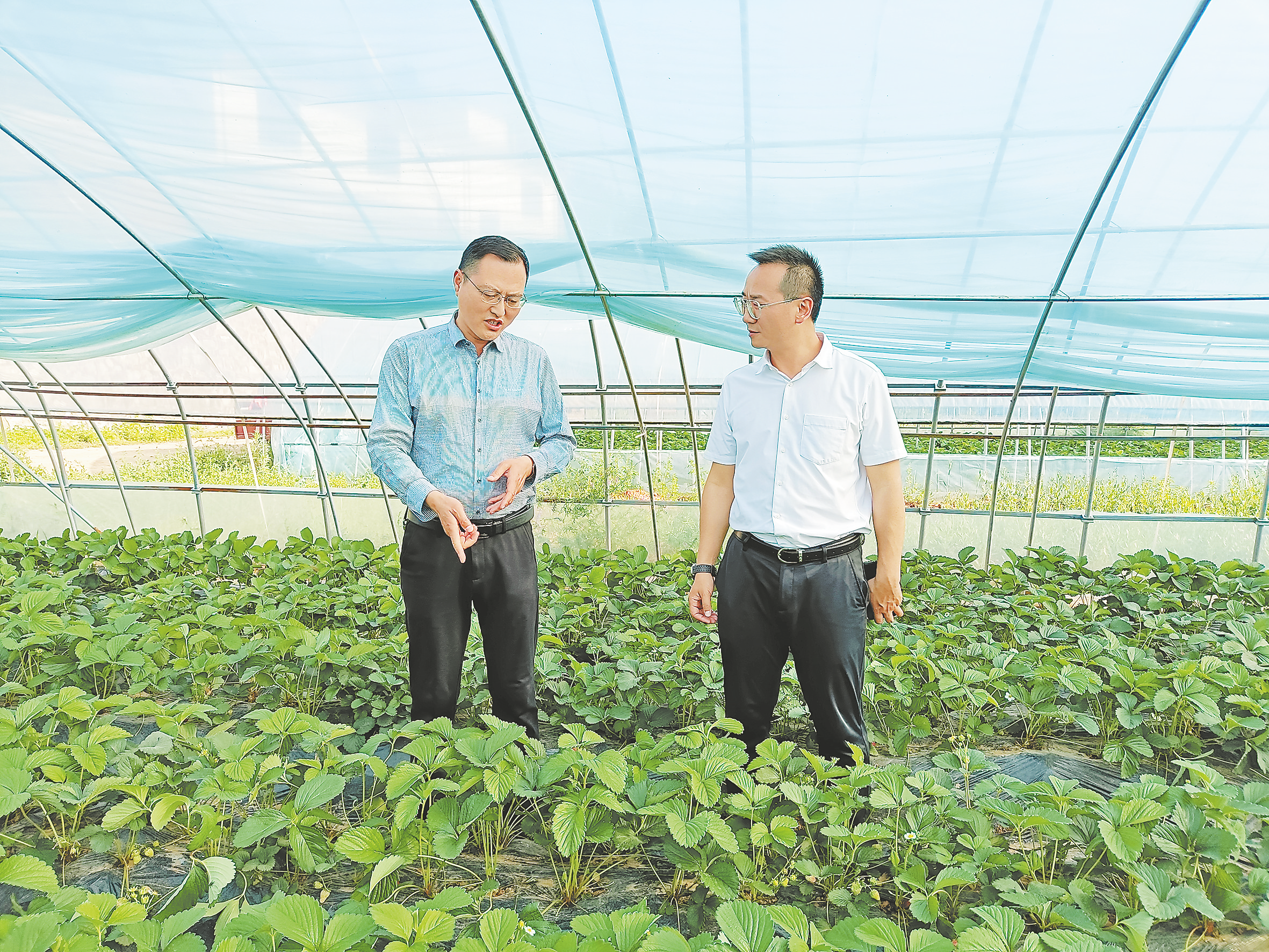 5月15日,蔡磊(右一)在板桥镇下湾村向区委办驻村工作队员代永涛(左一)了解草莓园经济效益情况。