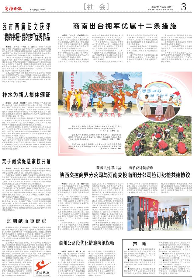 本报讯 (通讯员 马翠芳 陈 鑫)日前,中宣部印刷发行局公布2022年“我的书屋·我的梦”农村少年儿童阅读实践活动优秀作品名单,我市两篇征文获征文组优秀作品,分别是洛南县西街小学张泽予的《读〈立马中条〉有感》(指导教师杨秀丽)和洛南县华阳思源实验学校姜雪莹的《邂逅敦煌》(指导教师刘丹丹)。
