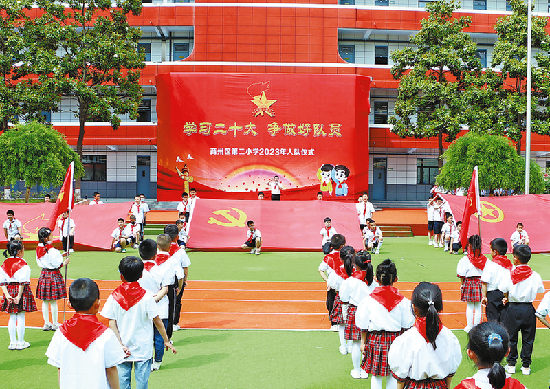 5月22日,商州区第二小学举行2023年“学习二十大 争做好队员”入队仪式,300多名学生加入中国少年先锋队。