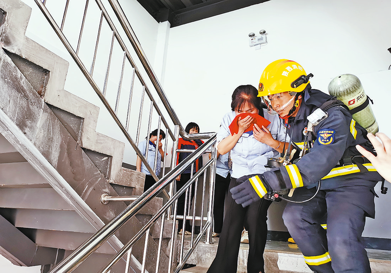 近日,洛南县古城镇联合县消防救援大队,在金翼服装厂等地开展防灭火应急疏散演练,并组织消防员为大家讲解紧急逃生自救常识和消防器械的使用方法、注意事项。 (本报记者 肖 云 摄)