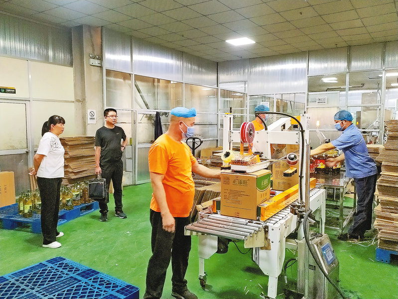 6月26日,工人在陕西五谷源食品生物技术开发股份有限公司食用油生产车间里将桶装食用油装箱。该公司位于丹凤县商镇中小企业孵化园内,依托我市丰富的核桃、花生、油菜籽等资源,年生产各类食用油2000多吨,安置60多名劳动力就近务工,人均月收入3000多元。 (本报记者 贾书章 摄)