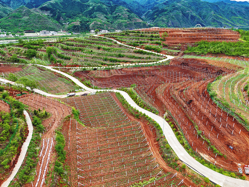 棣花牛头岭万亩葡萄基地 (本报记者 贾书章 摄)“咱镇上建成了万亩葡萄基地,这在过去是想都不敢想的事。多亏有了这个项目,我在葡萄园务工一天能挣80多块钱,给咱农民办了个大实事!”6月8日,在丹凤县棣花镇茶房社区北坡的牛头岭万亩葡萄基地,正在葡萄园指导务工村民给葡萄幼苗掐芽科管的魏振庄高兴地说。