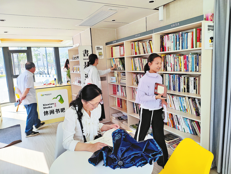 6月25日,市民在商州区南秦河生态公园方志书吧阅读地方党史。南秦河生态公园设有多个小型书吧,提供地方志、党史等图书资料,为市民提供便捷的休闲阅读环境。 (本报记者 贾书章 摄)