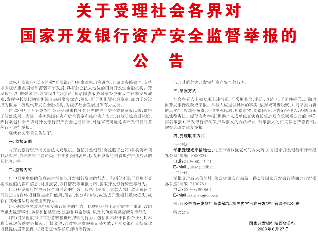 关于受理社会各界对国家开发银行资产安全监督举报的 公 告
