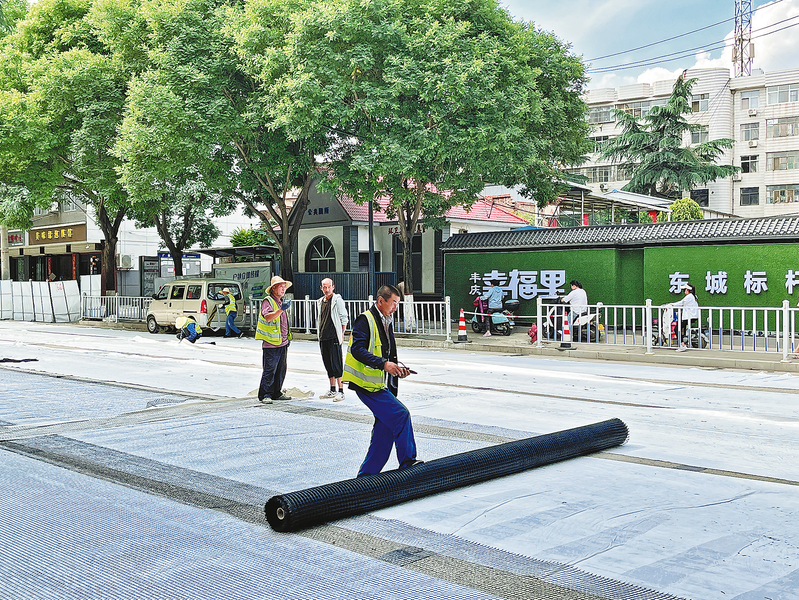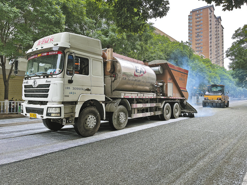 工人铺设网格布,为铺沥青做好基础工作。“以前,小区门口这段路一到下雨天就容易积水,出行很不方便,现在道路平坦又宽敞,出行体验感大大提升。”近日,家住商州中心城区商鞅大道东段的李先生对改造后的马路赞不绝口。道路改造完成后,黑色的路面减少了行车时的“眩光”影响,交通标线也更加显眼,保障了市民出行安全。