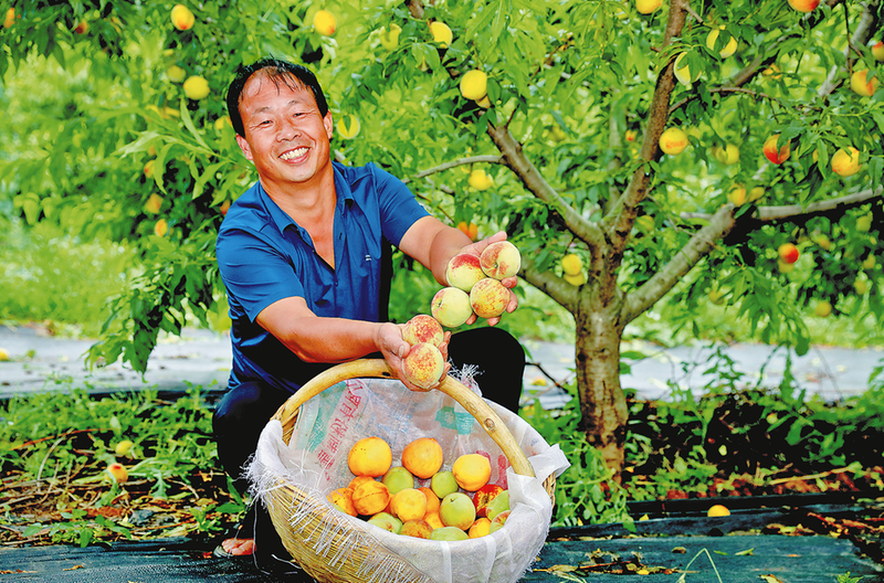7月3日,丹凤县商镇王塬村水果种植户闫朝阳正在自家的30亩种植园内采摘桃子。据了解,王塬村近年来发展农旅结合产业,其中建设油桃、蟠桃、黄桃种植采摘园共计150亩,预计今年可收益50万元。 (本报记者 杨 鑫 摄)