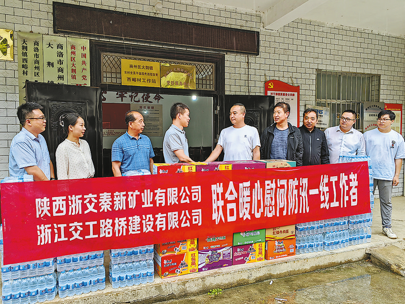 7月3日,陕西浙交秦新矿业有限公司、浙江交工路桥建设有限公司为企业矿区属地的商州区大荆镇西峪村捐赠方便面、矿泉水等生活物资,协助村上做好近期防汛工作。 (见习记者 刘桃李 摄)