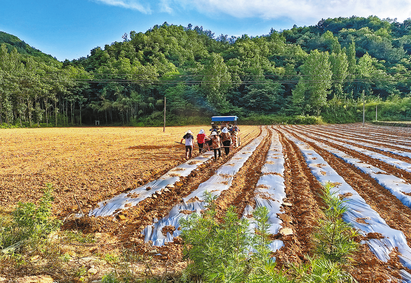 近日,在商南县青山镇新庙村的田间地头,随处可见村民忙碌的身影,开沟、运苗、覆膜、打眼、覆土、栽种辣椒苗,不一会儿,一排排辣椒苗就整齐排列在薄膜上,成片绿油油的辣椒苗长势喜人。