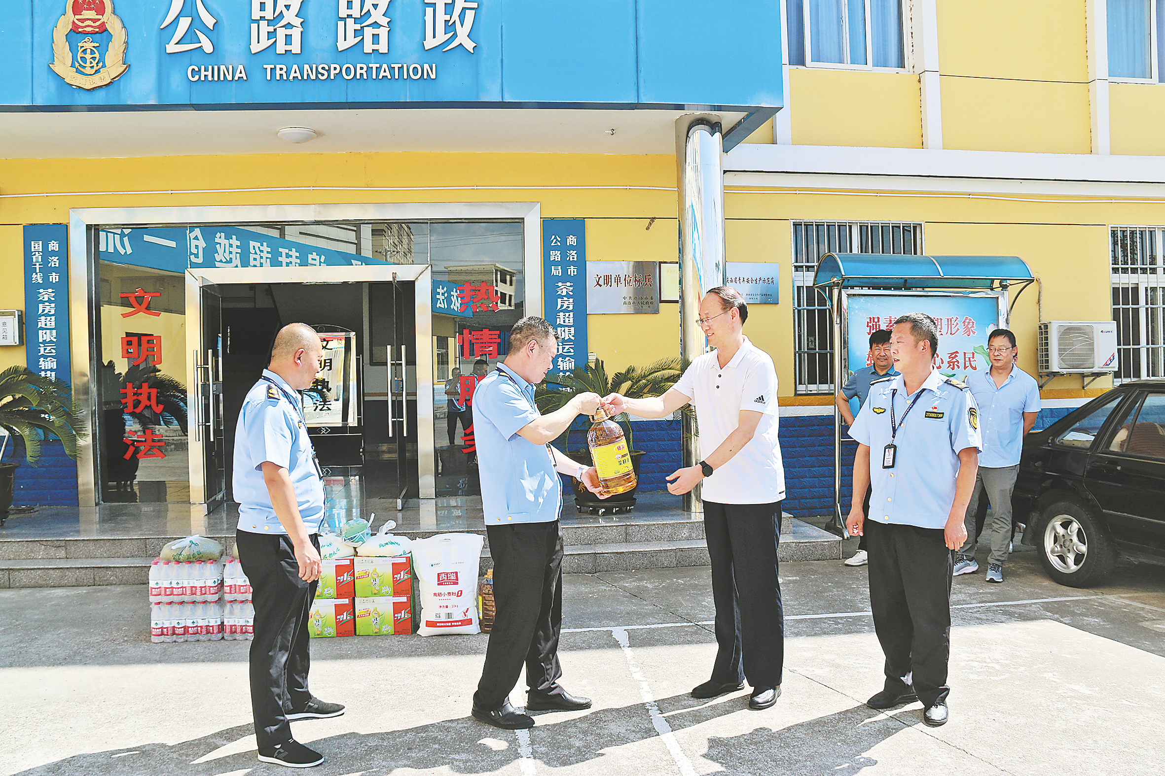 △近日,省公路局及市公路局相关领导来到茶房超限检测站开展“夏日送清凉”慰问活动,为一线职工送去慰问品。 (本报通讯员 刘丹玲 摄)