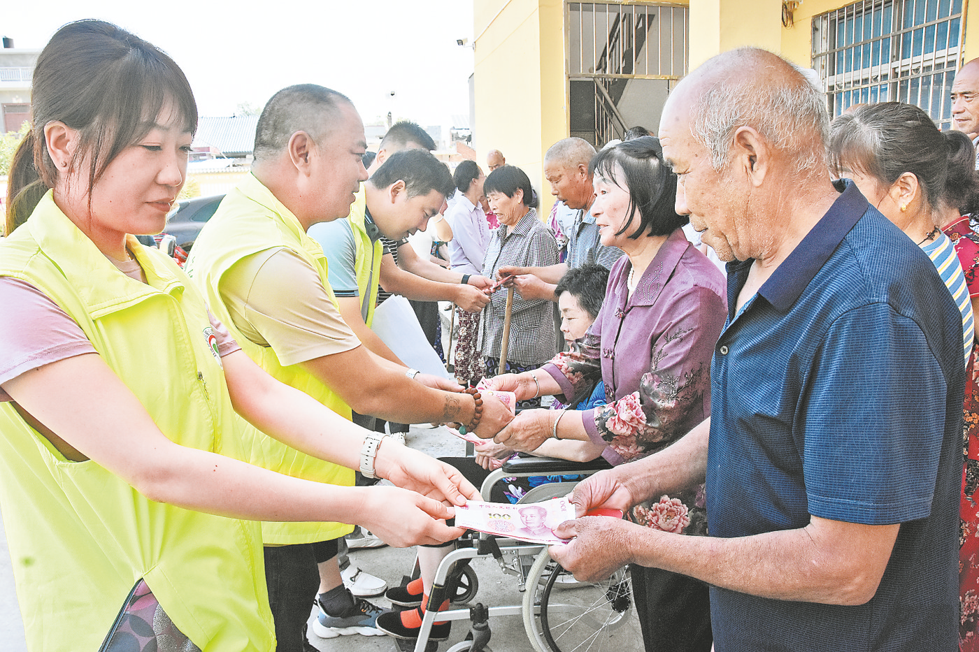 ▷7月22日,江苏省老龄事业发展基金会、丹凤县爱心朝阳志愿者协会联合在丹凤县棣花镇两岭社区开展献爱心活动,为部分残疾人、困难老人、困难群众发放现金、太空被等。 (本报通讯员 刘春荣 摄)