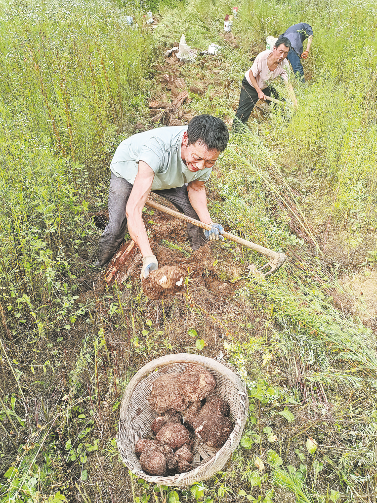 7月11日,双坪村收到次日有雨的气象预报后,为防止已经成熟的茯苓腐烂,迅速组织13名群众抢收茯苓。据了解,双坪村集体经济发展茯苓4亩,共收获2000多公斤,