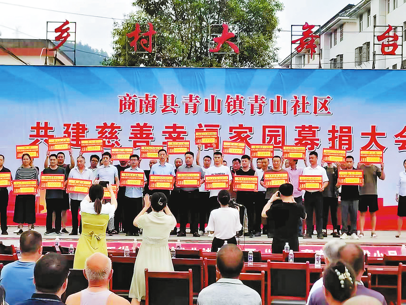 8月8日,广大企业家和社会各界爱心人士慷慨解囊,为商南县青山镇青山社区“慈善幸福家园”捐款。据了解,现场共募集资金21万元,主要用于社区开展关爱“一老一小”活动、急难群众救助和公益设施建设。 (本报记者 马泽平 摄)